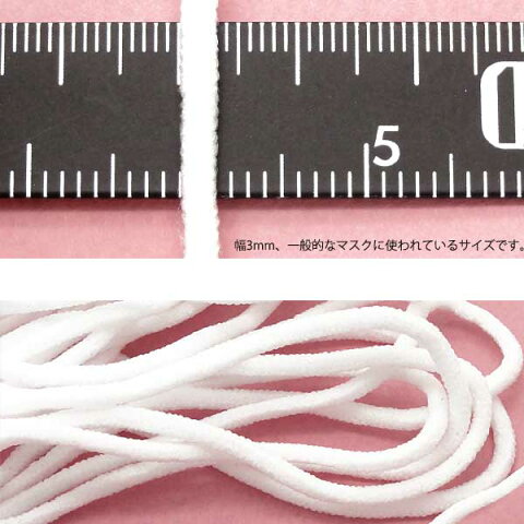 [商品名] マスク用ゴム3mm幅3m [サイズ] 幅:約3.0mm 長さ:3m [素材] レーヨン、ナイロン [ご注意] ※実際の商品になるべく近い色を再現しておりますが、ご覧になっているモニターの色の違い等により、実際の商品と色味が若干異なる場合がございます。